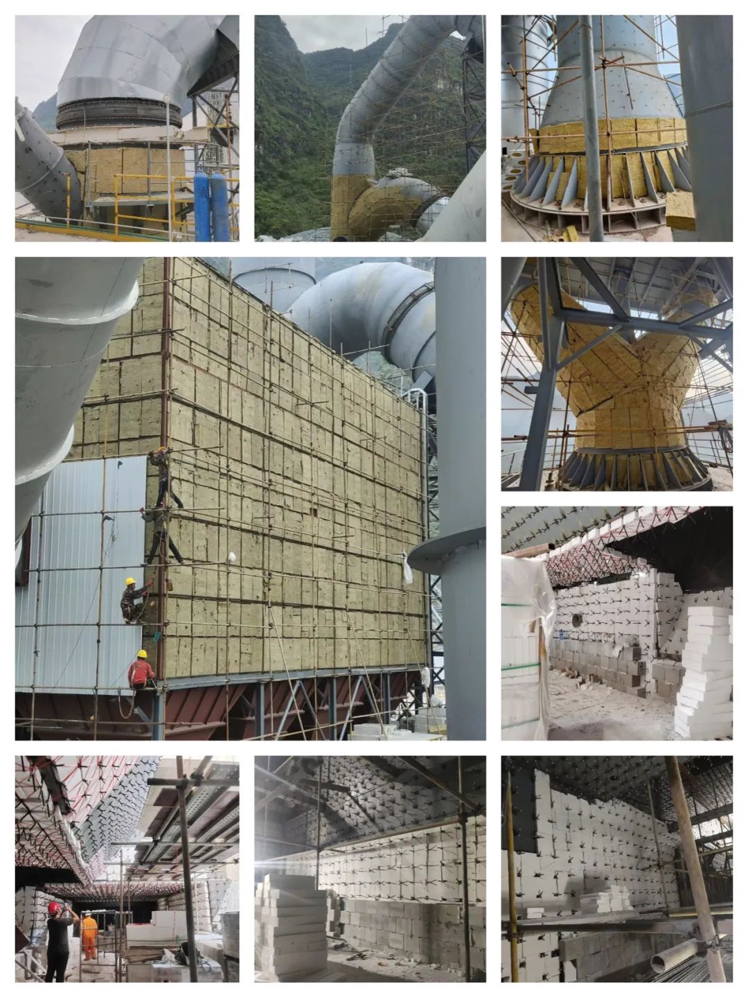 該新型干法熟料水泥生產(chǎn)線的預(yù)熱器、回轉(zhuǎn)窯、窯頭罩、三次風(fēng)管、篦冷機(jī)、煙室、下料管、沉降室等部位所需的硅酸鈣板、納米隔熱板、硅酸鋁纖維毯、巖棉板等保溫材料由盛世金鼎供貨并全程提供技術(shù)支持服務(wù)。